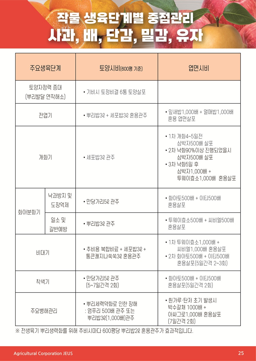 작물 생육단계별 중점관리(사과, 배, 단감, 밀감, 유자)