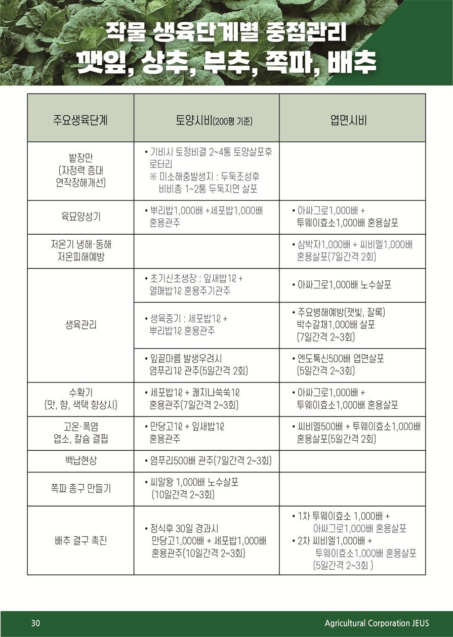 작물 생육단계별 중점관리(깻잎, 상추, 부추, 쪽파, 배추)